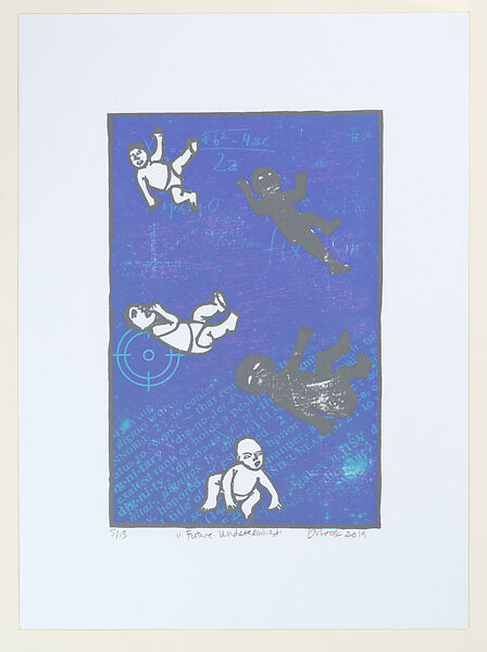 In this print, Mack-Watkins, a mother and an educator, visualizes Black babies’ time in the womb and contemplates their futures on earth. Babies tumble through a space filled with text, targets, and mathematical formulas. Nebulas evoke creation and stars symbolize mortality, while other visuals refer to positive childhood experiences, such as creative expression and education, as well as negative elements, like the inequities and mistreatment the children may encounter. The artist Betye Saar (born 1926) acted as inspiration for Mack-Watkins here. The influence of Saar’s art, especially her 1990 print Return to Dreamtime, is formalized through Future Undetermined’s vivid blue background, visual elements, and use of symbolism.