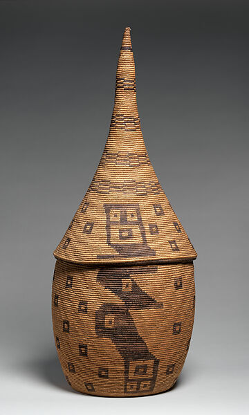 In Tutsi communities across Rwanda and Burundi vegetal fibers and reeds have been harnessed in the construction of renewable architecture. While men are responsible for the design and execution of those monumental structures, women have mastered the embellishment of their interiors with creations that range from the boldly woven panels that define distinct spaces within to refined basketry receptacles for storage of valuables. The distinctive elegant configuration of Tutsi lidded baskets evokes that of the architectural vernacular on an intimate scale. Their exteriors are emblazoned with a rich repertoire of dynamic graphic motifs in black or red ochre. This example is exceptional for both its impressive scale and the complexity of its elaboration that includes a figurative motif that spans the lid and lower half on either side.