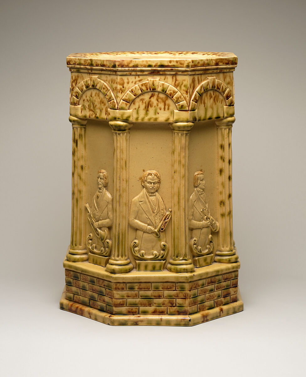 The design is likely by British émigré potter, Charles Coxon, who was born into a family of Staffordshire potters. His design training presumably came from the potting district’s Pottery Mechanics Institution, which educated potters in "Geometry, Design, Drawing, Modelling, Painting, Engraving, and the various Arts of Decoration." This ambitious design was probably made only shortly after Coxon immigrated to America in 1849, and he joined the E. & W. Bennett Company, founded by another Staffordshire émigré Edwin Bennett, where Coxon quickly assumed the role as their designer and modeler.