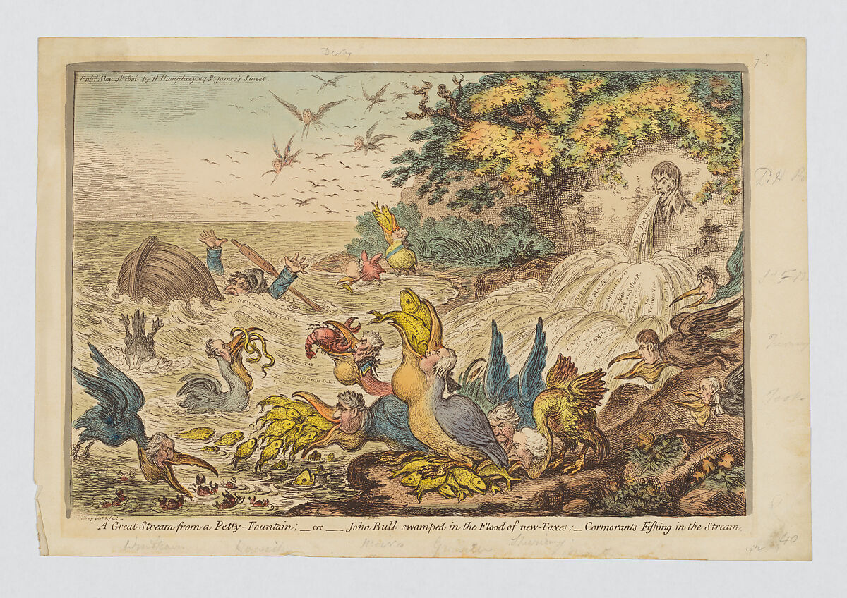 A master of political satire, Gillray here uses watery metaphors to comment on new taxes proposed by the "Ministry of all the Talents," a coalition formed after the unexpected death of primeminister William Pitt, the Younger in January 1806. To raise revenue to fund the extended war with France, they hoped to increase income taxes and erase many exemptions, all embodied here as a flood that origininates from the mouth of Lord Henry Petty, then falls in stages into an "Unfathomable Sea of Taxation." Cormorants with human heads and beaks, and pelican-like pouches swarm to eat the fish (representing funds produced by the taxes), while John Bull, who embodies the nation's tax payers, has been thrown from his small boat and lost hold of an oar labeled "William Pitt." Each of the human-headed birds relates to an associate of the new ministry.