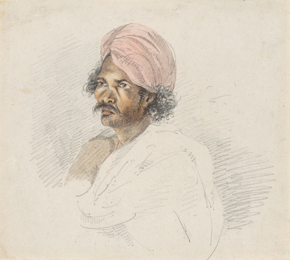 This sensitive portrait of an unidentified Sri Lankan man of Tamil descent is a rare surviving sketch from the short-lived career of Samuel Daniell (1775–1811) younger brother of William Daniell (1769–1837) and nephew of Thomas Daniell (1749–1840), renowned illustrators of Indian landscapes and monuments in the late 18th century. The diminutive scale of this drawing suggests that it is a page from a sketchbook, and its freshness of execution and the artist’s empathy for his subject all point to this being a study from life. It reveals an artist at ease with his subject, creating a portrait that conveys the dignity and self-esteem to the anonymous sitter, whose proud demeanor is immediately apparent.