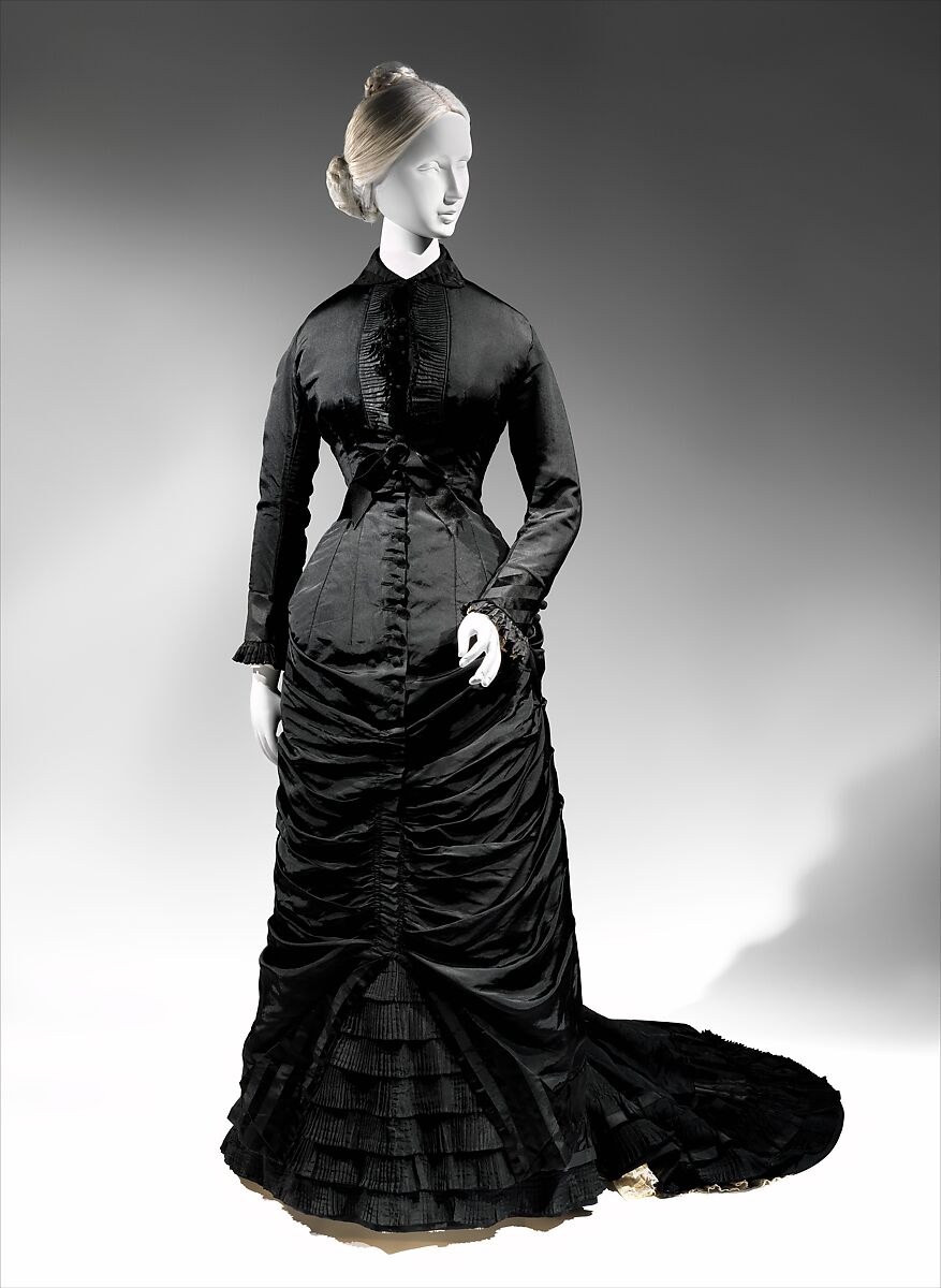 The popularity of black in the second half of the nineteenth century was stimulated by the introduction of chemical dyes of that color in the 1860s. While tasteful and timeless, black remained associated with death and the garb of the widow—a woman often imagined as dangerously independent and alluring. Appropriate for third-stage mourning, this black silk faille dress blurs the distinction between mourning and fashion, and its original use remains unknown. Cut with princess seams, the dress forms the tight, smooth fit over the hips that epitomized late 1870s fashions.