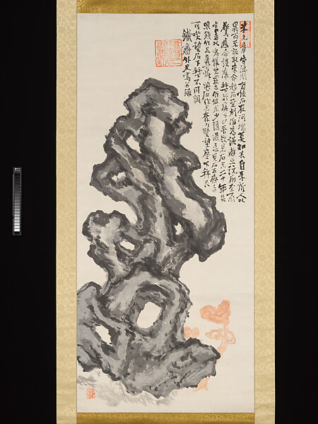 This startling composition by the renowned modern Literati painter Tomioka Tessai captures the appearance of an upright Taihu rock. In Chinese gardens such rocks were understood to represent fantastical mountains with dimples and holes suggesting grottoes. Tessai has brushed this rock with various layers of wet and dry ink brushstrokes to suggest its rugged surface and highlight its unique shape. Two sprigs of auspicious fungi painted in pale vermilion stick out from behind the rock. An inscription in Chinese by the artist, brushed in his idiosyncratic hand, resonates with the bold outlines of the rock. Tessai relates the famous story of Mi Fu (1051–1107), a noted poet, artist, and politician of the Northern Song dynasty, who discovered what he called his “Elder Brother Rock,” and had it moved to his garden. Tessai was no doubt copying the account a from a later Japanese recension of the Song-dynasty collection of literary anecdotes Random Notes of Master Liangxi (Liangxi manzhi 梁溪漫志) by Fei Gun 费衮. Tessai’s transcription reads: