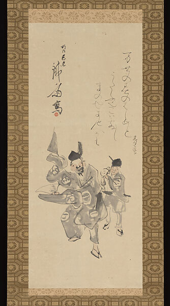 Tessai’s spontaneous rendering in ink and washes, with a touch of light color, captures the vitality of the performance. The famous poet-calligrapher Nun Rengetsu, who early on supported Tessai’s career as an artist, has added one of her poems, transcribed in her distinctive delicate kana script, with an admixture of kanji rendered so cursively that they blend in harmoniously.