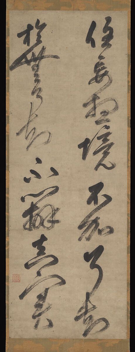 Inscribed by Zekkai Chūshin, these two columns of cursive Chinese characters feature a famous passage from the Sutra of Perfect Enlightenment, a foundational scripture in Zen (Chan) Buddhism. This text provides guidance on how to free oneself from delusion and rediscover one’s original, inherent state of enlightenment. Zekkai lectured on this sutra at various times in his career, including to the shogun Ashikaga Yoshimitsu (r. 1368–94).