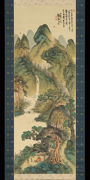 This work is a colorful landscape filled with auspicious symbols of longevity. In the center, the gray-bearded man sitting in a thatched pavilion can be identified by his elongated forehead as Jurōjin, the Daoist deity of longevity. A red-crowned crane, associated with marital fidelity and longevity, is perched by his side. Nearby, a pair of rugged pine trees stand tall, their long needles likewise symbolizing long life. Red auspicious fungi grow at the base of the pines, believed to extend one’s life span if they are ingested as part of elixir. A precipitous waterfall flows from the lofty green mountains, dotted with Mi dots, large ink dots that representing lush pines. Above the hills, a red sun and a blue crescent moon complete the auspicious scene.