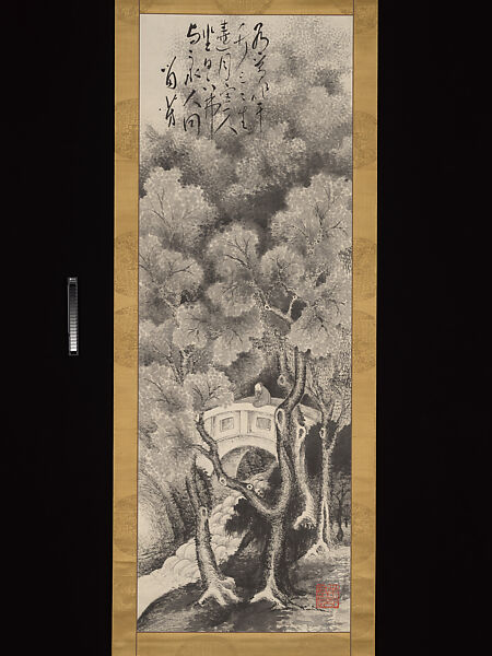 Hashimoto Dokuzan was a leading figure in early twentieth-century Zen Buddhism, serving as abbot of the major monastery Shōkokuji in the city of Kyoto and served as chief, kanchō, of the Shōkokuji branch of the Rinzai sect of Zen from 1909 to 1933. Before he entered the priesthood, he trained to be a painter under the celebrated literati artist Tomioka Tessai and continued to paint throughout his life. The present worked shows a lone Chinese man in a deep woods, leaning over the railing of a stone bridge to gaze at rushing stream below—a scene of communion with nature that East Asian painters have turned to and reinterpreted for a thousand years. Painted entirely in ink, Hashimoto contrasts the dry, detailed brushwork of the figure, bridge, and the foreground landscape motifs with soft wet dots in a range of dilute ink for the trees’ dense foliage.