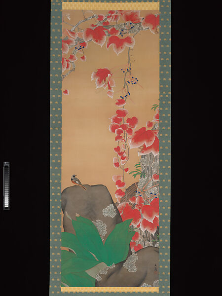 The mood of autumn is caught in this vignette of coloristic drama by the Nihonga artist Oka Buntō, who trained in the kind of naturalistic realism advocated by his Shijō school teachers. At the same time, he plays with broad expanses of color and blank space in abstract ways that reveal the new tendencies of modern painting in Japan. Sitting on the rock is a single small bird, which resembles a jay (kashidori or kakesu), though the artist seems to have taken liberties to make the under plumage redder than usual, no doubt to echo the vibrant orange-red of the dangling vines of Japanese ivy (Parthenocissus tricuspidate), which has clusters of blue berries in the autumn season. Outcrops of lichen on the gnarled tree trunk and smooth stone are rendered with an almost sculptural effect.