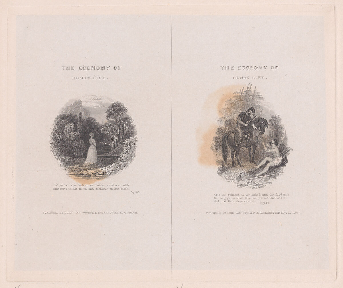 Printed from one plate, these two images come from a set of twelve. They were made for an illustrated book published in London by John van Voorst in 1834. Each centers on a vignette illustration, with the book's title above, quotes and publication details below.