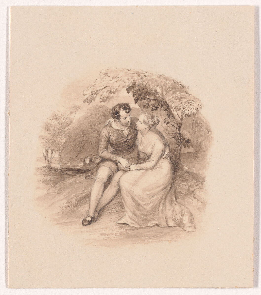 A couple holding hands are seated next to a tree.One of a group of twelve book illustration designs reproduced as an engraving in an 1834 edition of Robert Dodsley's "The Economy of Human Life," published in London John van Voorst. The image illustrates the text: "Oh! cherish her as a blessing sent thee from Heaven. Let the kindness of thy behaviour endear thee to her heart."