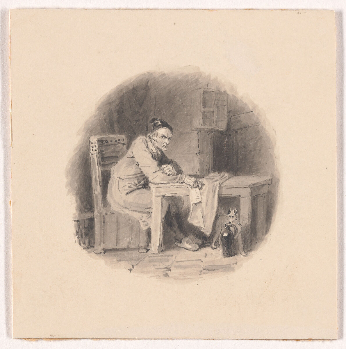 A sour faced man sits next to a table. One of a group of twelve book illustration designs reproduced as an engraving in an 1834 edition of Robert Dodsley's "The Economy of Human Life," published in London John van Voorst. The image illustrates the text: "He sitteth in his cell repining, and the good that happeneth to another is to him an evil."