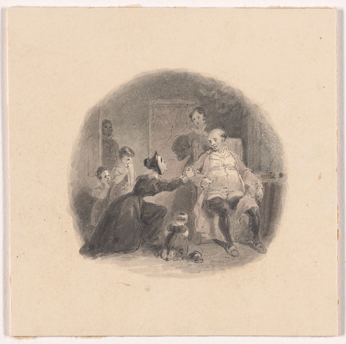 A widow accompanied by two children kneels to implore aid from a portly man seated next to a table, a woman standing behind him. One of a group of twelve book illustration designs reproduced as an engraving in an 1834 edition of Robert Dodsley's "The Economy of Human Life," published in London John van Voorst. The image illustrates the text: "When the fatherless call upon thee...when the widow's heart is sunk, and she imploreth thy assistance with tears of sorrow...oh pity her affliction and extend thy hand to those who have none to help them."