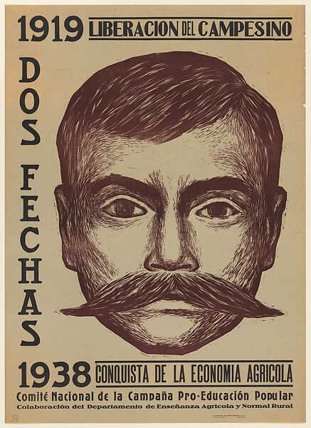 - Title: Poster commemorating two dates: the liberation of Mexican farmers in 1919 during the revolution, and 1938, the anniversary of Mexican economic independence. A portrait of Emiliano Zapata dominates the poster