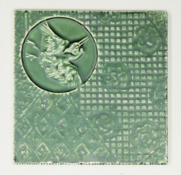 Such decorative tiles were employed in a variety of domestic and commercial settings, such as fronts for fireplaces, mantles and soda fountains in the late nineteenth century. Arthur Osborne was an Englishman who was Low's chief modeler. The impressed overall pattern of this tile resembles a Japanese textile. The tile is glazed in a shiny blue-green which has been made mat by an acid treatment. For other examples of J. and J. G. Low Art Tile Works, see 1970.100.1–.12, 1971.141, 1971.182.1–.11, 1977.373.1–.16, 1991.196, and 1993.514.