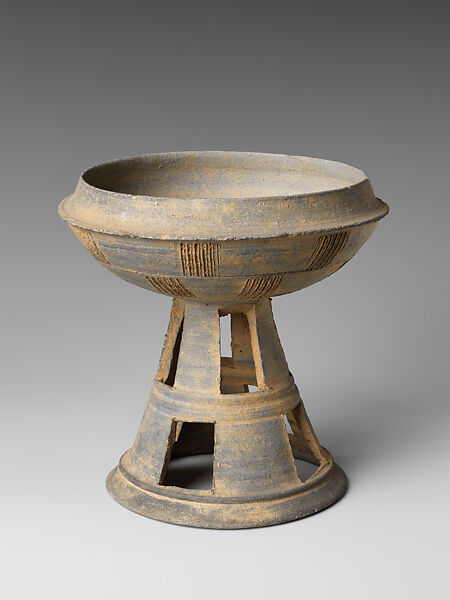 This work of art is currently on loan to the museum.This pedestal dish was used in daily life as well as in mortuary rituals. It is typical of stoneware produced in the Silla Kingdom and the Gaya Federation. Vessels like these have been excavated in large amounts, with and without their lids, from tomb sites along the Nakdong River, in southeast Korea, the area of the former territories of Silla and Gaya.