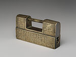 Created for security, locks are interesting objects in their melding of function and design. This lock has the typical shape and locking mechanism of late 19th- and early 20th-century locks. One side is left undecorated and the other is highly ornamented with an inscription and geometric motifs; thus the lock has a back and front with the key hole on the right. Even with the typical shape, this lock had a round key, which differs from the more prevalent L-shaped key. As objects used to protect precious goods, some inscriptions on locks express a wish for an abundance of fortune and material wealth, while others are auspicious messages about having a long life.