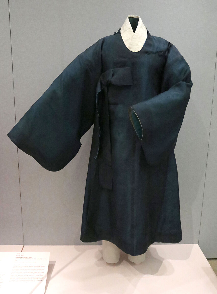 During the Joseon dynasty there were many rules and restrictions surrounding clothing. Class and wealth determined the garments, colors, and materials one could wear. Joseon menswear is largely divided into five categories: trousers, long-sleeved tops, vests, robes, and coats. The sleeve width, collar style, and body-panel construction of a robe define its type and date. This example, in dark blue with a round collar and wide sleeves, is from the nineteenth century. In the mid- and late twentieth century, when Western dress became dominant in everyday life, robes like these were worn at weddings and rituals.