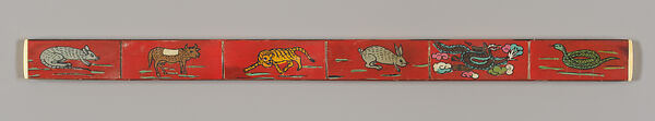 Each of the twelve segments of the ruler is decorated with a zodiac animal. The sequence follows the order of the zodiac with the rat on the left end and the pig on the right. Although the images are small, the artisans used short dashes to indicate the ground plane and clouds around the dragon to situate the animals in space.