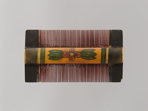 Joseon paintings dating to the 18th and 19th centuries document the popularity of ornate braided and bouffant hairstyles for women. Men would have their long hair in tight top knots. Combs with fine teeth and oils would be used to achieve these styles. This comb is made from single piece of wood and the spine is decorated with painted ox horn. The motif is painted on a very thin slice of ox horn that is translucent and the painted side is affixed to the wood. Thus the flower decoration is being seen through the thin slice of horn.
