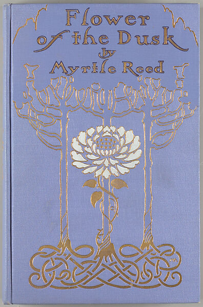 Lavender, vertically ribbed cloth stamped in white and gold flower between outlined trees with stylized linked roots, title and author stamped in gold with black outlines; title, author, publisher, and scroll work stamped in gold on spine; top edge gilt. In slipcase, white textured paper over board with same image as cover printed in lavender on front and back. Signed MA [Margaret Armstrong]. Series binding.