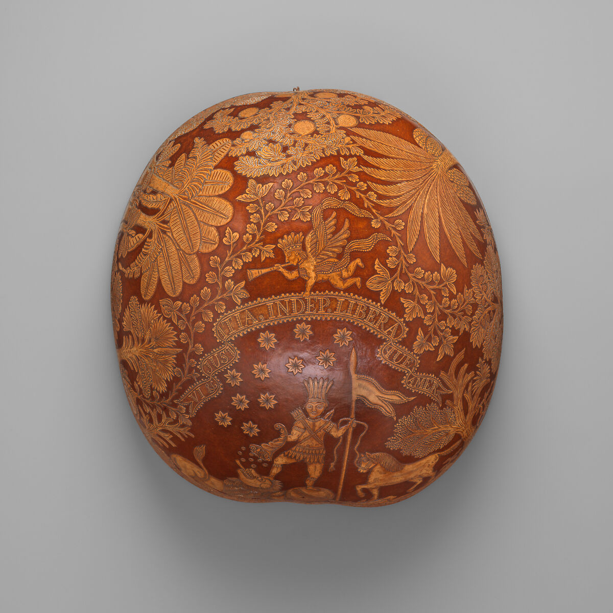 This large gourd bowl celebrates Mexican independence from Spain, which was achieved in 1821. Its carved decoration features victorious America, personified by an Indigenous man who stands on top of the Spanish imperial symbol of a lion with two globes, the uppermost one inscribed "Amer[ica]," and the one beneath it, "esp[aña]." The winged figure of victory, also characterized as a native American, blows a trumpet and displays a banner that reads: VI ET JUSTITIA. INDEP. LIBERAQUE AMER. (By strength and justice America is independent and free). He holds a cornucopia in one hand and spills coins that symbolize not just wealth, but natural abundance. In his other hand he holds the reins of a horse (often a symbol of New Spain) with a broken scepter beneath its hooves. The eleven eight-pointed stars in the background point to a prevalent genre of patriotic astrology in which the bigger, brighter, and more numerous stars of America’s skies were thought to reveal God’s providential design. Under their beneficial influence, the land was a temperate and bountiful paradise. More than half of the gourd is carved with representations of native flora, including a date palm, bananas, and calabash and cacao trees, as well as other unidentified plants. (Ronda Kasl, Curator of Latin American Art)