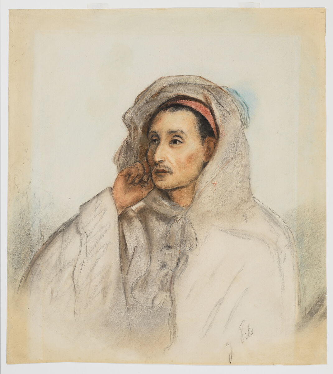 Pils spent two years living in the Kabylie region of Northern Algeria, studying the landscape and people in preparation for a commission commemorating the visit of Emperor Napoléon III and Empress Eugénie to the area in 1860. This pastel drawing of a distinguished sitter wearing a voluminous burnous (hooded cloak) was likely intended as an independent work based on its large scale and the fact that the artist signed the sheet.