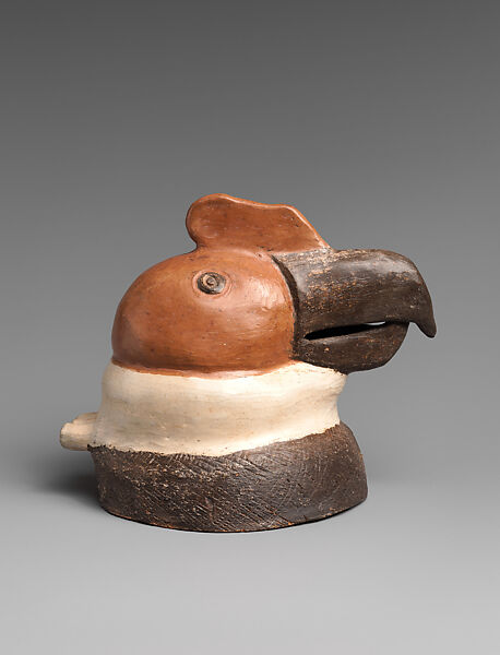 Pottery whistles have been widespread throughout South and Central America for many centuries, where working in clay enabled their makers to experiment with sophisticated sounding mechanisms such as ducts with chamfered fipples and multiple chambers and fingerholes. Their figural forms are often works of art in their own right as well as illuminating aspects of the culture of their makers. This whistle in the form of the head of a condor is a modern representation of this continuing tradition.