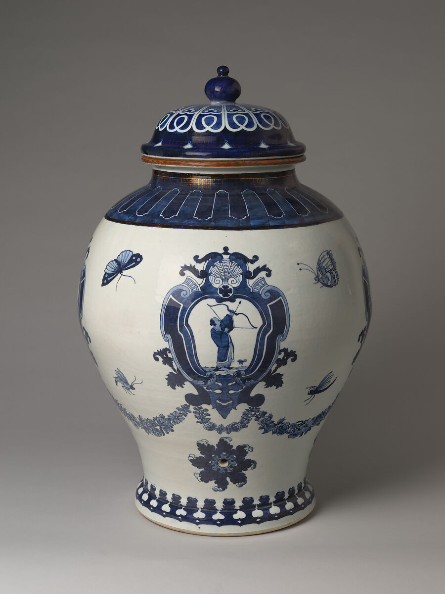 This water cistern is a rare example of Chinese porcelain with a design attributed to Cornelis Pronk (1691–1759), a Dutch draftsman working for the Dutch East-India Company (VOC). In 1734, the artist was commissioned to make sets of drawings for the decoration of Chinese porcelain, which were sent to China in 1736. Various porcelain dinner services and tea sets in underglaze blue and polychrome enamel were thereafter produced in China and sent back to the Netherlands. Known as “The Archer,” the design on the current piece is among four attributed to Pronk. This work highlights a significant moment when a Western artist became directly involved in creating designs for Chinese export porcelain during the mid-eighteenth century.