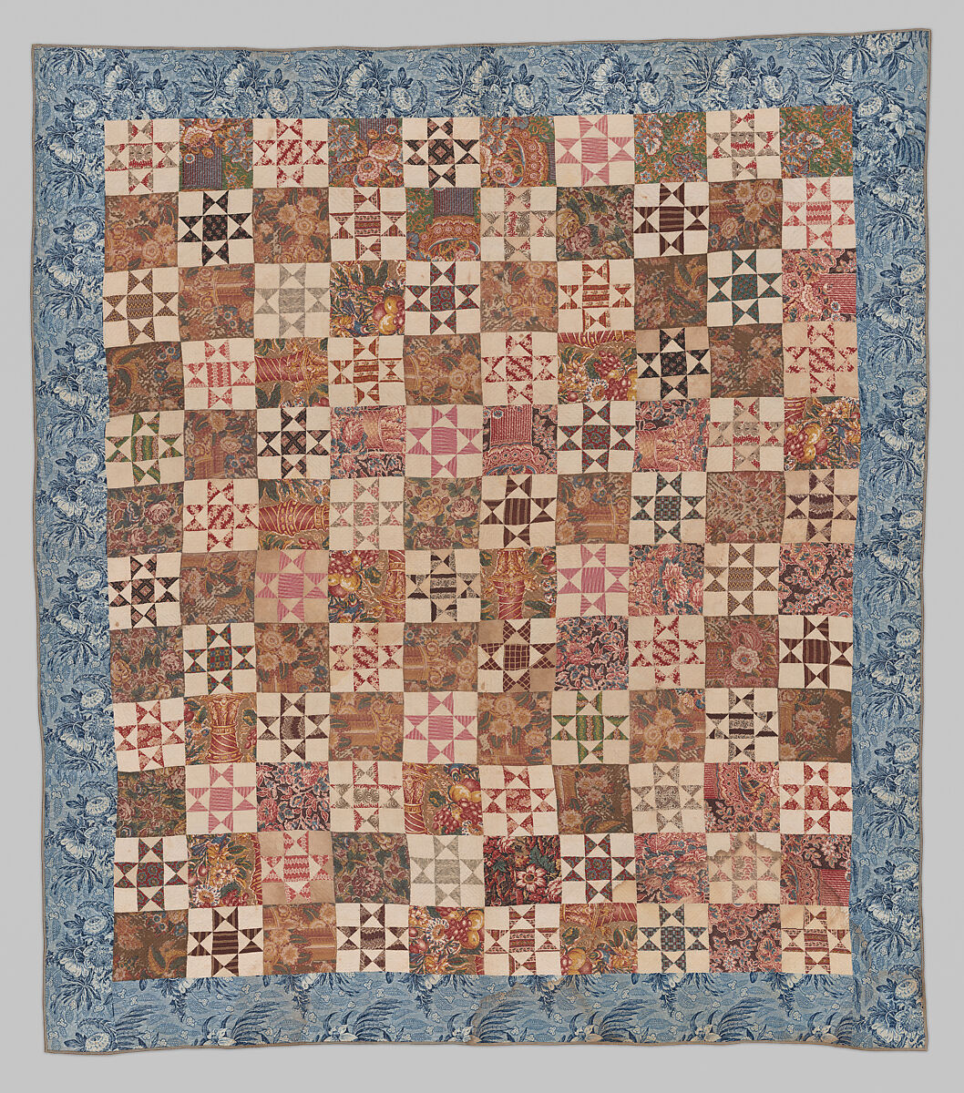 The anonymous female creator of this pieced quilt probably intended it for use within her own home, or as a gift to friends or family. Her work is composed of patches of more twenty reused printed textiles made across a span of about thirty years- reclaimed from cut-up garments and upholstery. The quilter has cleverly composed these seemingly disparate elements into a strong, bold and coherent repeat pattern.