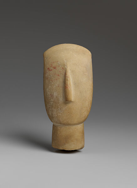 The head, which once belonged to a relatively large figure, is elongated and lyre-shaped, with an arching crown that contrasts with the rather straight, wide chin. The long nose in relief is centered and begins at the point where the forehead begins to curve back, clearly visible in the profile. The back of the head and neck are quite flat, except for the projecting crescent-shaped ridge along the top, and are differentiated by well-defined grooves that meet in an angular configuration characteristic of the Spedos type.