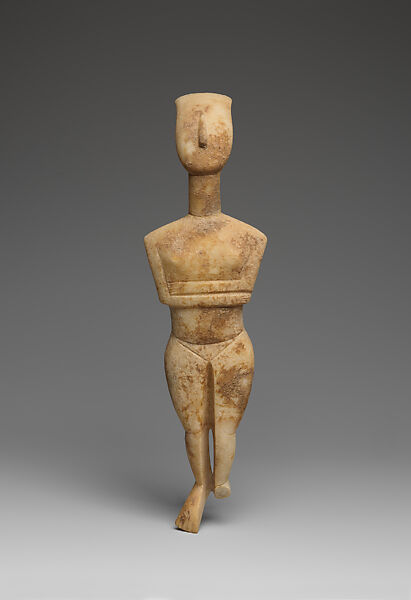 This fine-grained, white marble figure is complete, the left foot detached, except for chips on the heel of the right, and mended breaks at the knees and base of the neck. The backward-tilted head is lyre-shaped with a rounded chin, flat crown, and small triangular nose carved in relief at the center of the facial plane. The long narrow cylindrical neck is delineated from the head by a curved shallow groove at front and back. A similarly shallow groove, curved at the front and v-shaped at the back, delineates the neck from the torso. The shoulders are pronounced, angular and slightly sloping. Arms are folded tightly left over right above the abdomen and below the gently rounded breasts carved in low relief. Short shallow incisions describe four fingers on the left hand and five on the right. A shallow incision below a swollen abdomen indicates the beginning of the pubic triangle. The figure has wide, well-rounded hips, bent knees and slightly arched legs delineated by a deep vertical groove at the front and back. Shallow horizontal grooves describe the knees and ankles, and slight incisions delineate five toes on the extant foot. The ankles are connected and the foot splays outward. At the back of the figure, a shallow vertical groove defines the spine and the separation of the slightly protruding buttocks.