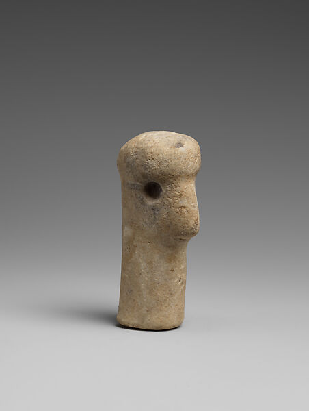 This marble head with a long cylindrical neck are is all that remain of a standing or seated figure. It features a slightly bulbous crown above bored eye sockets, perhaps for inlays, and an especially prominent, rounded nose above a lightly incised mouth. The marble surface is weathered with erosion along the grain boundaries. There are remains of brown accretions particularly thick on the lower third of the reverse and on the break surface at the bottom. There are traces of a whitish material at the holes drilled for the eyes, but no further evidence for hypothesized inlays. The head is similar to those found on Late Neolithic standing and seated figures known throughout Greece and the Balkans. (1)