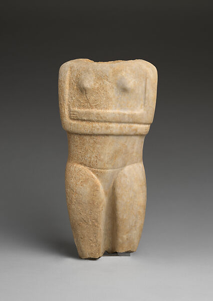 The fragment belonged to a masterfully carved figure of Early Spedos type that originally measured more than 80 cm in height. Pat Getz-Preziosi has identified the arrangement of the arms in which the right hand extends as far as the left elbow as a convention used in the work of a number of sculptors.