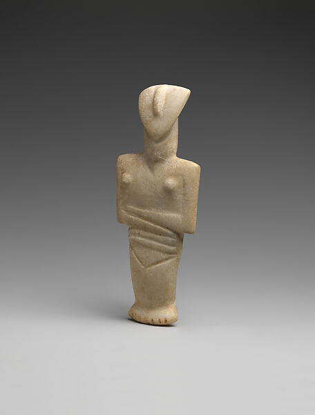 This small, marble figure is complete with only slight superficial losses and a repair at the neck. It depicts a reclining female figure with a triangular-shaped, backward-tilted, flat head with a wide, rounded crown, v-shaped chin, and a broad nose carved in relief high on the facial plane. To the right of the nose may be the ghost of a painted lentoid/ovoid right eye with a tiny dot for the pupil. The long, thick, cylindrical neck joins the sharply squared shoulders and torso at a v-shaped indentation. The upper arms project at the sides and the tapering forearms are folded left over right below widely-spaced, conical breasts carved in relief. Below the folded arms are two deeply-defined, horizontal belly folds. Shallow grooves indicate the pubic triangle and vulva, the latter continuing unbroken into the groove that delineates the figure’s disproportionately short, thick, cojoined legs and equally thick, stubby, slightly arched feet. Short grooves describe four toes on each foot. At the back of the figure, a thick, v-shaped incision indicates the base of the neck. From here, a continuous, vertical groove describes the spine, separation of the buttocks, and boundaries of the legs and raised heels of the feet.