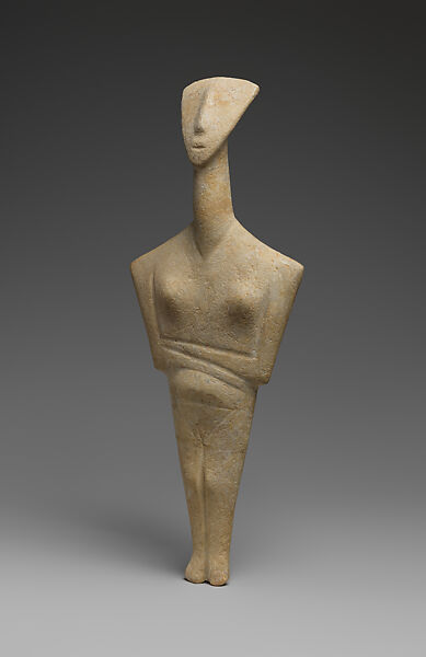 The Dokathismata type, named for a cemetery on the island of Amorgos, is characterized by the triangular-shaped head, broad, angular shoulders, straight legs differentiated by a shallow groove and the overall flatness of the figure. The incised mouth of this figure, created by a short straight groove, is highly unusual, but does appear in other examples.