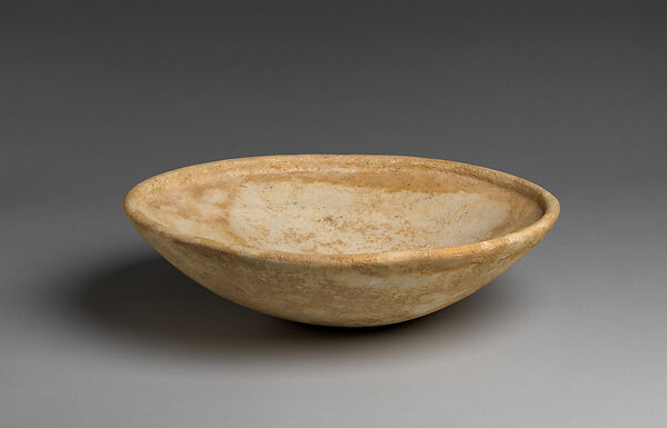 This relatively deep, large marble bowl is recomposed from at least three fragments with additional mended losses at the rim. The smooth sides of the vessel gradually flare upward and outward to meet a clearly defined rolled rim. The latter is emphasized by a horizontal groove around the interior of the vessel. This particular bowl is a relatively deep version of the well-known rolled-rim type. (1)