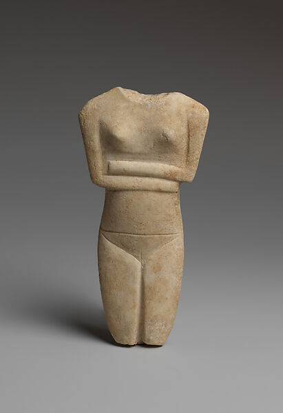 The fine white marble torso and thighs are all that survive of this female figure, which would have originally stood ca. 55.0 cm high. A recent hole at the break of the neck may have been intended for joining the neck with a head. Large losses on the reverse of the legs and back are unfilled. Traces of a shallow curved incision delineate the base of the neck. The figure has deeply sloping angular shoulders, the right one chipped and filled in. The lightly arched forearms, sculpted in low relief without indications of fingers, are folded left over right below evenly spaced low-relief conical breasts and above a long, narrow slightly bulging abdomen. Incised lines across the entire pelvis indicate the pubic area with a fine vertical stroke for the vagina. The rounded thighs taper toward the knees. Deep vertical grooves delineate the joined legs at the front and back. A fine vertical groove at the back delineates the spine as far as the sharp angular protruding buttocks.