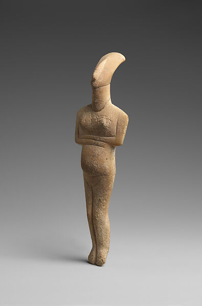 The reclining female with a lightly arched back and bent knees is complete with only minor losses at the toes of the left foot and a mended break at the neck. Its lyre-shaped head, dramatically tilted back, has a flat crown, round chin, and a long, thin, well-centered nose in relief. The latter extends nearly the entire length of the face. The top of the head is smooth with perhaps a ghost image of hair, or a hat or scarf. The long, upward-tapering neck is set off from torso by an incised line that curves up and around the back. Its broad, sloping shoulders characteristic of the Dokathismata type are slightly asymmetrical. Shallow, vertical grooves delineate the upper arms that project from the sides of the torso. The arms are folded tightly, left over right, below the figure’s broad chest with unevenly placed, conical breasts in relief. The bulging belly hangs low, perhaps indicating a late stage of pregnancy. Shallow grooves at the base of the belly and top of thighs denote the pubic triangle. An incised groove at the vulva deepens to indicate relatively short, co-joined legs. The feet slightly splay outward from the ankles and light incisions delineate ten toes. The back of the torso is carved flat with a single vertical incision denoting the spine and separation of the buttocks.