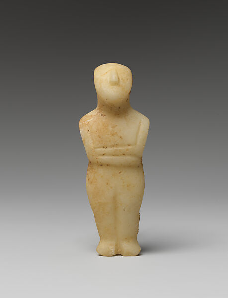 This fine-grained white marble figure is complete and intact with no sign of significant damage or previous structural treatment. The backward-tilted head is lyre-shaped with a rounded chin, flat crown, and wide triangular relief nose set in the middle of the face. A light incision at the back of the head appears to suggest a squared-off hair paint ghost. The short thick cylindrical neck flows smoothly into sloping rounded shoulders with arms folded left over right indicated by shallow incisions. No breasts, fingers, or pubic triangle are indicated A wide shallow groove delineates the joined legs with outsplayed feet without toes. The plain smooth back is flat without buttocks. The knees are slightly bent and the feet are slightly raised on the toes.