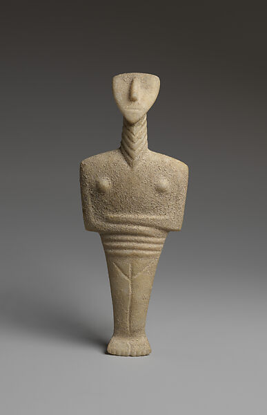 Among the most contentious pieces in the Leonard N. Stern Collection, the authenticity of this work is particularly open to debate with strong arguments for and against. It is clearly the product of a talented artist whose work shares strong affinities with sculptures attributed to an ancient Cycladic sculptor known as the Dresden Master, so named after a work in the Dresden Museum. It also exhibits unusual features, most notably its fine state of preservation, exceptionally large size for the Chalandriani type, and the unparalleled series of bands carved into the neck. It is said to have been acquired in the 1920s by Joseph Weller, a prominent German businessman who is known to have collected antiquities, especially bronzes. However, there is no documentation to support this assertion. The calcareous accretion embedding abundant biotite flakes and the fibrous and fine botryoidal accretions on the back of the sculpture are unusual as well and would deserve further in-depth analysis to determine if they may have been artificially applied in modern times, or if they may be associated to a particular burial or geological context in the Cyclades.