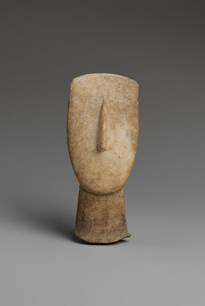 This fine-grained (maximum grain size ≈ 1.5 mm) white marble head and most of the neck are all that survive from a figure that would been approximately 70 cm high. There is a repair through the top of the neck, as well as painted fills on the top corners of the head and over the gouge on the back of the head. The lyre-shaped head, tilted back, has a slightly rounded crown and chin. A long, thin, aquiline nose in relief is well-centered at the brow. The incised groove that distinguishes the chin from the neck continues around the back to form a v-shaped nape. Close inspection of the differential weathering of calcite crystals on the head reveals traces of two almond-shaped eyes on the face with the lower part of a large, circular pupil in the left eye, and traces of a headdress or gathered hair at the back.