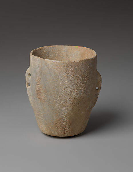This cylindrical marble beaker is complete except for mended losses at the rim and lugs. It carved from a slightly variegated, light grayish marble. Two long vertical, fin-shaped lugs on either side of the vessel are perforated for suspension, although it is unusual that the top half of one lug is pierced twice. The base is slightly rounded and the interior is smooth except for a low central boss at the bottom.(1)