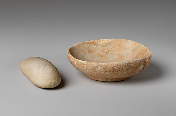 The bowl, carved from white marble, is largely intact except for several losses to the rim, including three large areas that have been filled and inpainted. Accretions cover much of the underside. The pebble, also white marble, has a smooth curved upper surface with a few losses at one end.