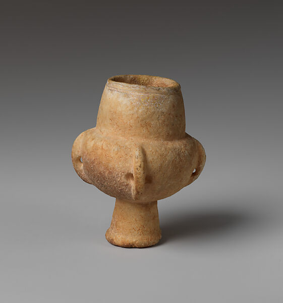 Produced in marble and clay, kandilai typically held liquids, such as oil or wine. Cords strung through the pierced lugs around the body could be used to hang the vase or attach a lid. Frequently found in tombs with marble figures, the vessels may have served a function in funerary rituals.