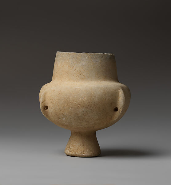 This is a nearly intact collared jar made from white marble with blueish striations with a pedestal foot and four crescent perforated lugs. It has a cylindrical, tampering neck, a wide mouth with a vertical rounded rim on a rather hemispherical body with flat shoulders, that stand on a compact conical foot. The gray-bluish striations of the marble in the area of the rim were used to create a visual effect. The conical foot at its bottom has a small concave hollow and wide standing ring-like edges. The crescent-shaped lugs are carved diametrically, protruding considerably, and pierced, cutting parts of body walls; they are not always placed vertically but they are in rather oblique angles. One is missing and has been restored. The interior has been carved in U shape. Tool marks may be seen there, which have been smoothened, suggesting the use of a bow drill. The outer surfaces are smoothened. Its large size is within the range of this vessel type as discussed by Pat Getz–Gentle.(1) Its closest parallel comes from the Panagia cemetery on Paros.(2) In the Stern Collection of Cycladic Art, L.2022.38.38, 36, and 72 are of similar size.