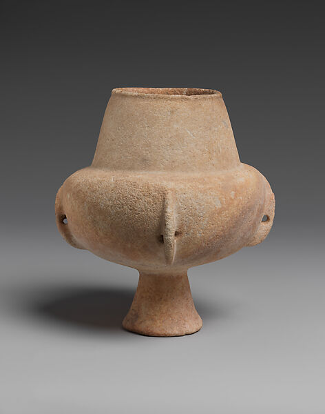 This white marble, collared jar with a pedestal and four crescent-shaped, perforated lugs is completely intact. It has an upward tapering, conical neck with a wide mouth and everted rolled rim. The hemispherical body with a flat, narrow shoulder stands on a compact conical foot that has a small concave hollow and wide ring-like edges slightly flared upwards. The four long, crescent-shaped lugs, carved crosswise at equidistance, considerably protrude from the body of the vessel. They are perforated, some cutting into the body. The interior has been carved in a U-shape with traces of a bow drill that have been smoothened. The outer surface was polished smooth.