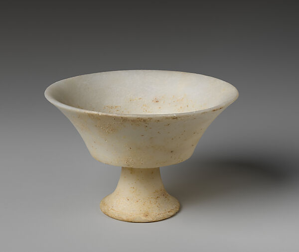 This carinated open vessel of white marble with a cylindrical stem and a bell-shaped foot is nearly intact with only minor losses at the rim and edge of the foot, and on the two interior fissures that run diagonally from the rim. The side walls flare up and out and the mouth ends in a pointed rim. The bell-shaped conical foot has a wide, flat standing edge and a shallow concave cavity at its underside. The surface is well-preserved and smoothed to nearly a polish. This type of vessel is briefly discussed by Getz-Gentle and its closest parallel in size and from an excavated context comes from Apeiranthos on Naxos.(1) Within the Stern Collection of Cycladic Art, L.2022.38.129 is another type of footed cup that resembles a small footed bowl.