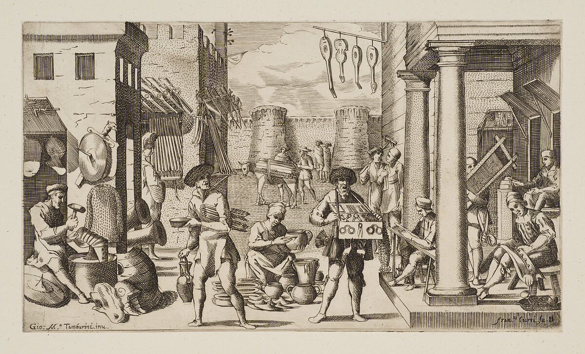 - Title: Man making armor, pot maker, vendors, etc., plate from "Virtù ed Arti Esercitate in Bologna" (Trades of Bologna)