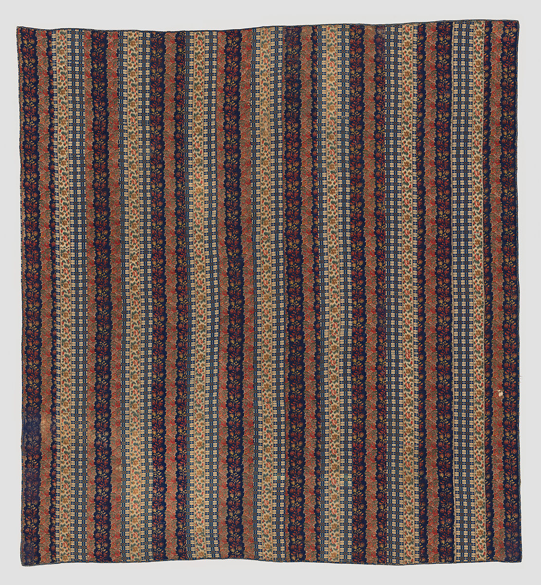 The strong verticals of this strip quilt glory in the decorative effects of its ombré fabrics. A marvel of modern science, for a very brief period such rainbow printed textiles were wildly in vogue for dresses and shawls. Patching and superfluous seams within this quilt’s strips reveal that the two fabrics used here had indeed previously been part of dresses. However, rainbow prints fell out of favor just as suddenly as they entered it, and will have been considered very old-fashioned by the mid-century. Perhaps the anonymous seamstress who so carefully assembled this quilt from old scraps appreciated the rainbow prints’ decorative potential as strong verticals for this work; perhaps she chose to salvage and reuse these two distinctive printed fabrics because of a special nostalgia or sentimental association with the garments they originally composed.