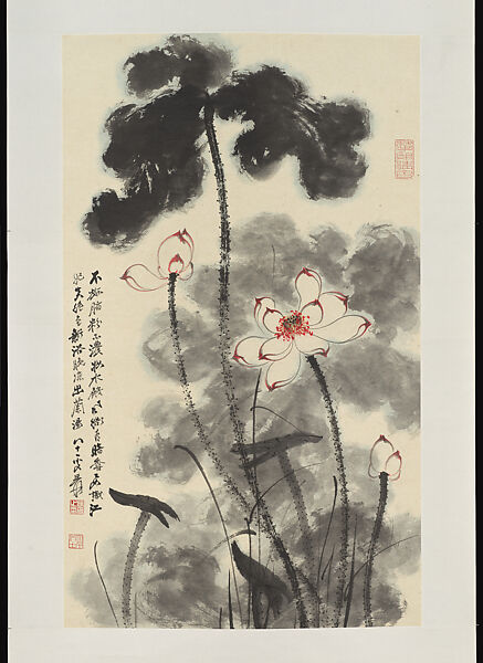 This work of art is currently on loan to the museum.In his later years, Zhang Daqian experienced vision loss. In response, he leaned into his interest in abstraction to create images driven by bold shapes, color fields, and the unerring strength of his hand rather than painstaking attention to detail. In this painting, made just three years before his death, Zhang’s leaves have become large, unruly daubs of ink and color. The power of his brush remains evident in the towering stems and in the flowers themselves, where he has strategically chosen to apply areas of detail to contrast with the boldness of the leaves.